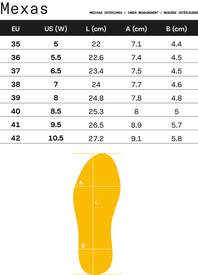 Designed for narrow feet. If you’re looking for the same design with more room, we recommend CHILAQUILÓN.