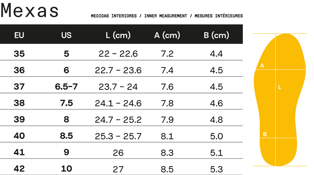 - Sole: Synthetic rubber with a height of 1 cm at the front and 1.5 cm at the heel. Lightweight, flexible, and with great traction for walking safely on different surfaces.